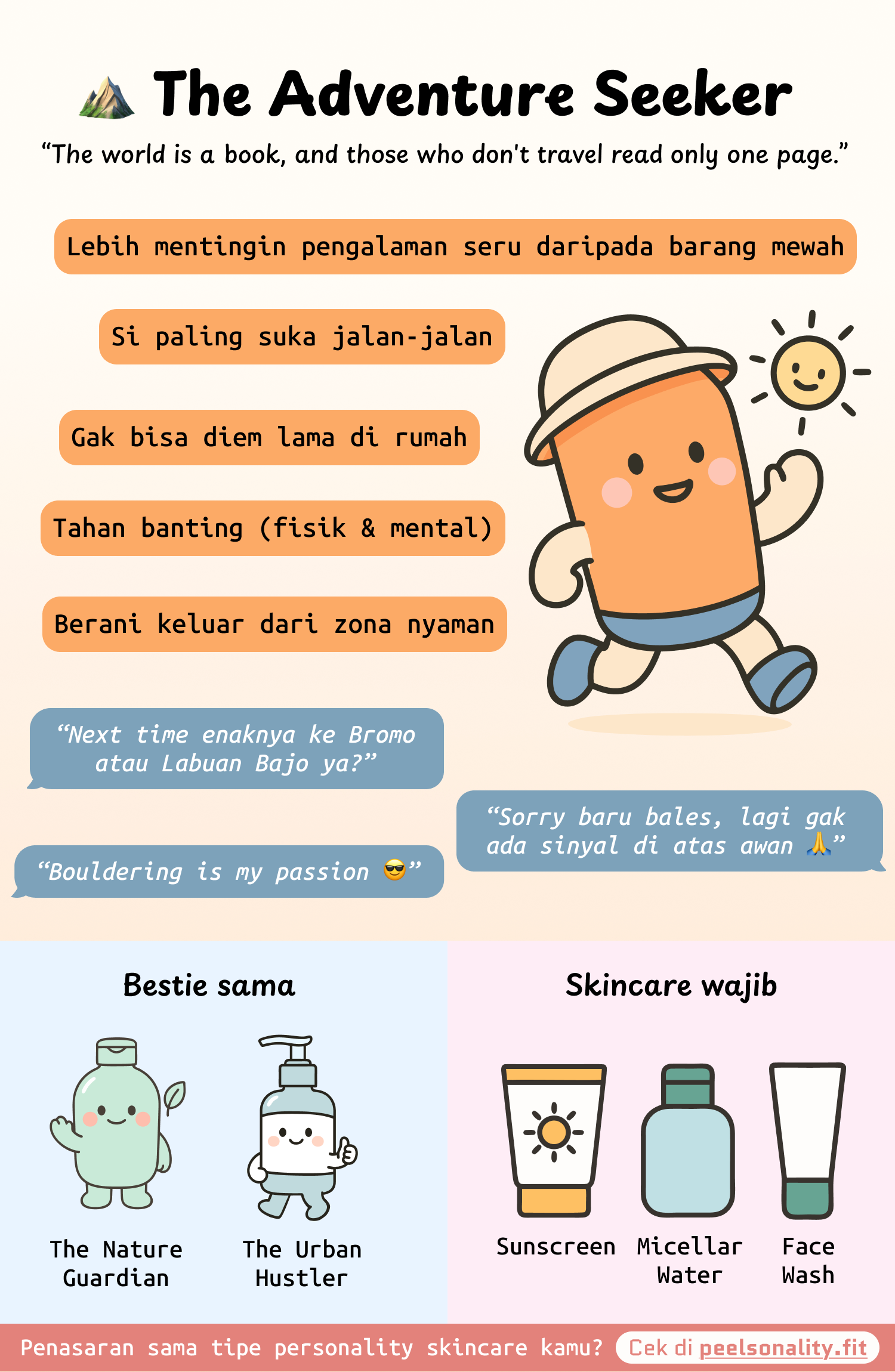 Kamu tipe orang yang nggak bisa diem! Weekend ideal versi kamu adalah hiking, ke pantai, atau explore tempat baru. Energi kamu nular ke orang-orang sekitar, dan kamu selalu cari pengalaman seru. Untuk skincare, kamu butuh produk yang praktis, tahan lama, dan bisa protect kulit dari paparan outdoor.